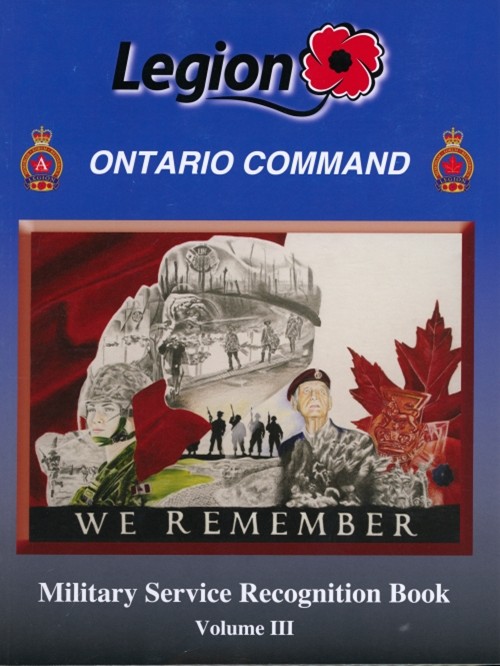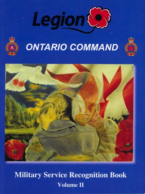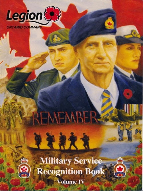 Cover of the "Military Service Recognition Book, Volume VII" by the Legion Ontario Command. Illustrations of veterans with poppies and a monument in the background.